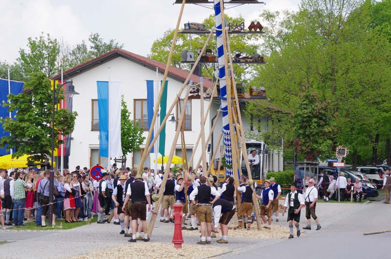 Hier in Bayern werden am 1. Mai die Maibäume aufgestellt. Fast jede Gemeinde und auch manche Stadtteile haben einen Maibaum. Das ist der Stamm eines hohen Baumes, dem die Äste entfernt werden. Dann wird er in Handarbeit über mehrere Wochen geschliffen und mit weiß-blauen Streifen bemalt. Am 1. Mai gibt es dann ein großes Fest, und der neue Baum wird in der Ortsmitte aufgestellt. Heutzutage geschieht dies meist durch einen Kran. Aber manche Gemeinden sind stolz darauf, den riesigen Baum auch heute noch per Hand aufzustellen – mit langen, zusammengebundenen Holzstangen. Das dauert ganz schön lange! Die Besucher sitzen solange zusammen, essen und trinken und tanzen zur Blasmusik. Der Maibaum gilt wahrscheinlich als Fruchtbarkeitssymbol – ganz genau weiß man das nicht. Aber immerhin haben schon die Wikinger am 1. Mai Bäume aufgestellt.
